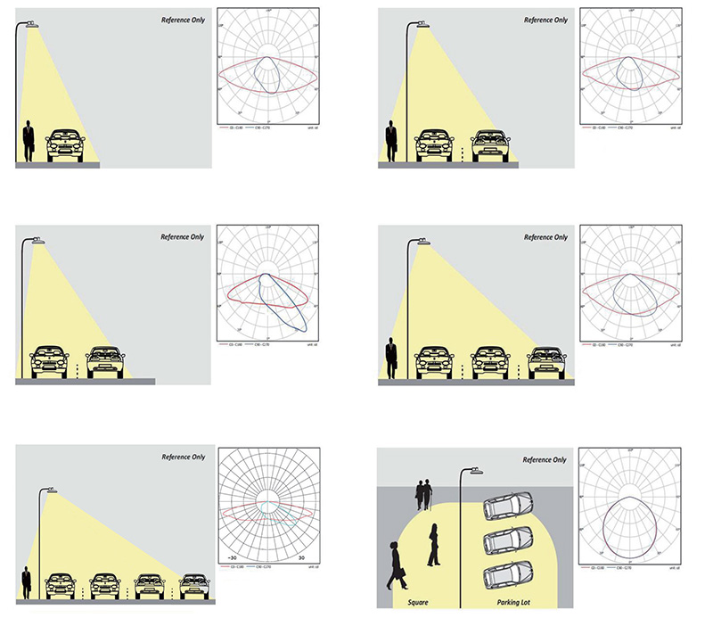 - タイプⅠ/Ⅱ/Ⅲ/Ⅳ/Ⅴの配光は、道路照明のさまざまな要件を満たすことができます。