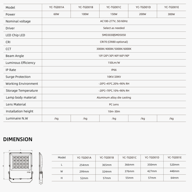 | YC-TGD01-50W | 358*294*52 | 50w | ヒートシンクアルミボディ、ガラス、ブラケット、304ネジ、 PCB、レンズ。 |